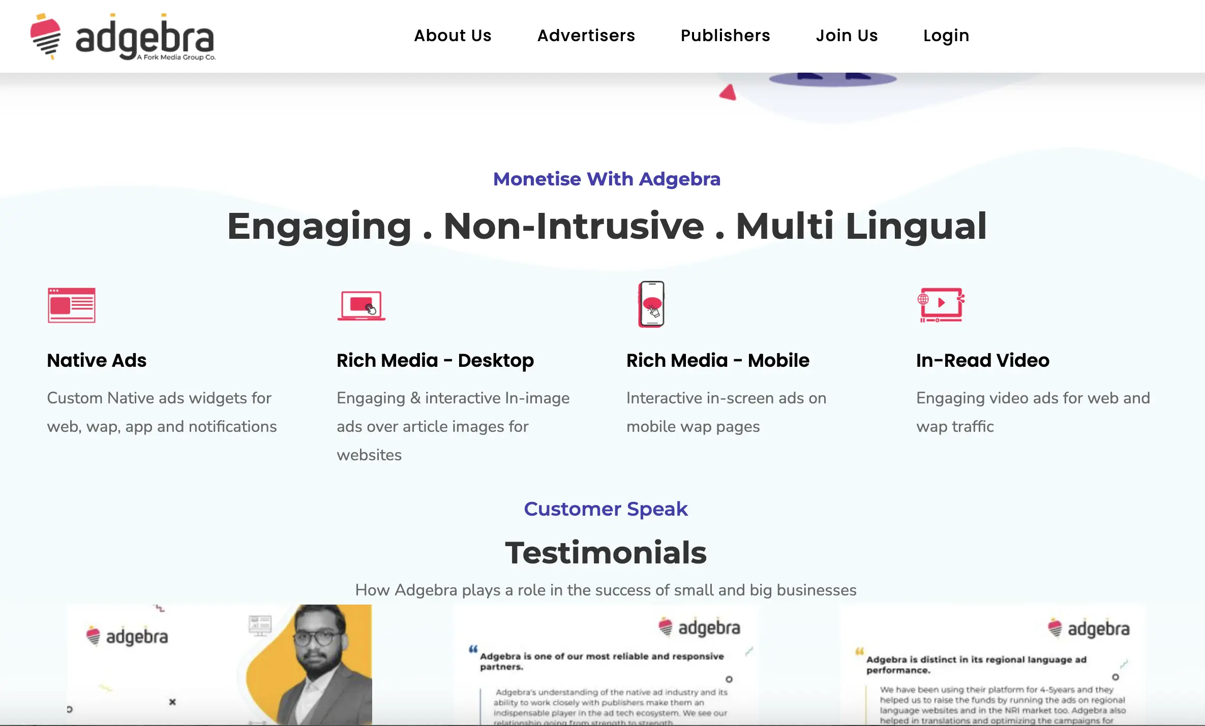Adgebra, a global adtech platform established in India, aims to champion the vernacular language ad-tech domain by making internet advertising language agnostic and accessible. Since 2013, the company has rapidly evolved to reach 500 million unique users, serving over 30 billionn native, rich media and video ads each month through its 2000+ premium publisher network. As a multilingual native ad platform, Adgebra empowers businesses to connect, engage and win the trust of billions of consumers, serving ads in 10 different regional Indian languages. Their clientele includes top publications and news aggregators like TV9 Network, The Print, ABP, DailyHunt, Oneindia, Sharechat, Tamil Samayam, Sakshi, LiveHindustan, NavbharatTimes, Maharashtra times, Khaleej Times, and more.