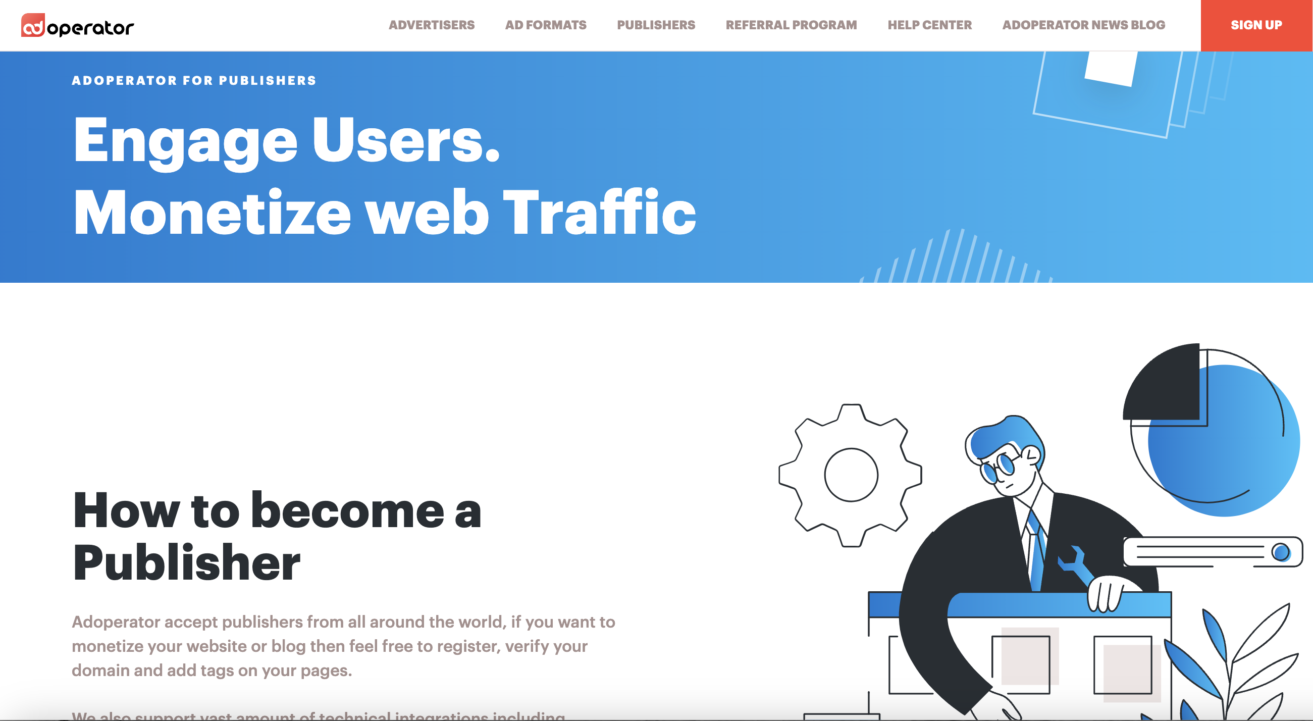 As an intelligent, programmatic self-serve platform, AdOperator is an easy solution to make your ads profitable by engaging users and monetizing web traffic through 100% authentic human traction. AdOperator supports a vast amount of technical integrations including OpenRTB, XML feeds, and JS tags to monetize your website or blog via adding tags to your page.