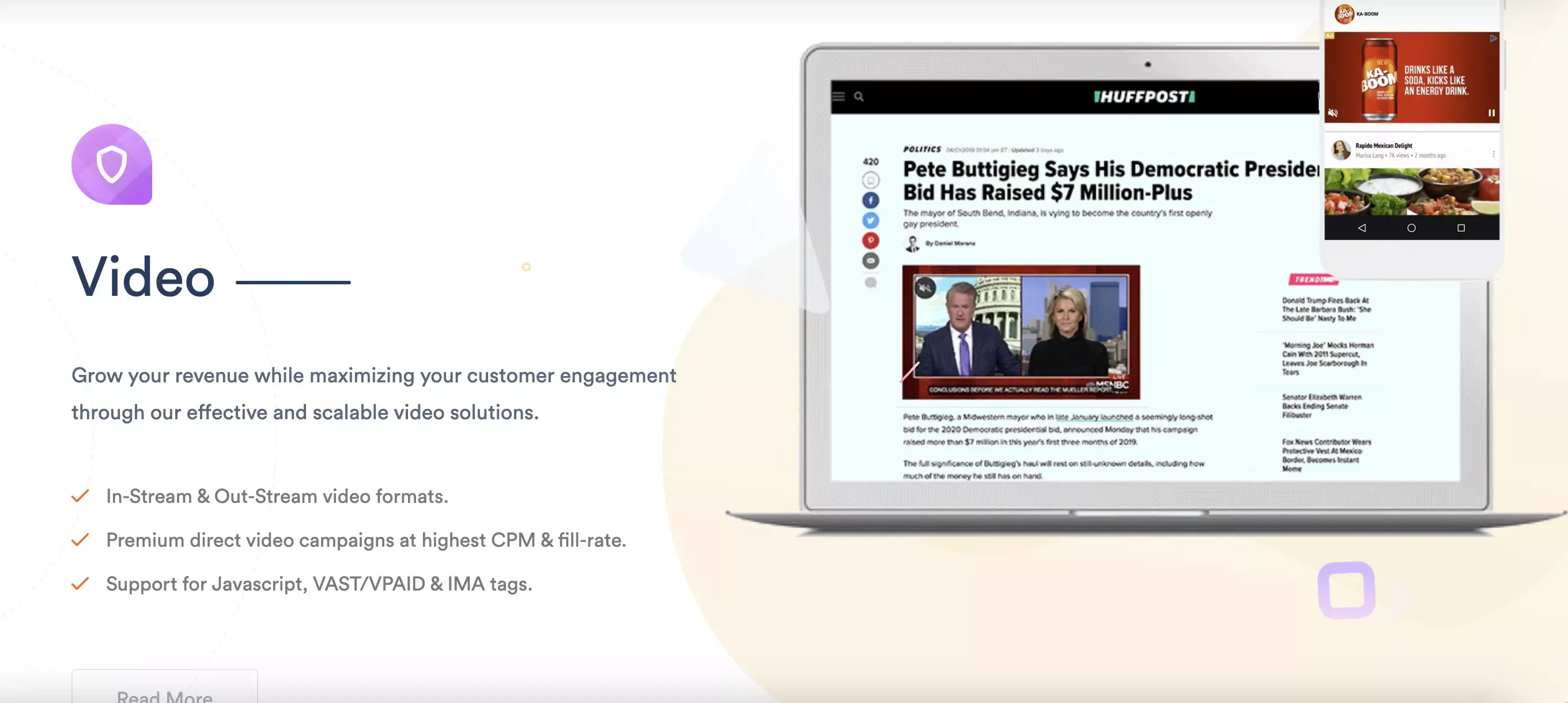 - Support for Javascript, VAST/VPAID & IMA tags.
