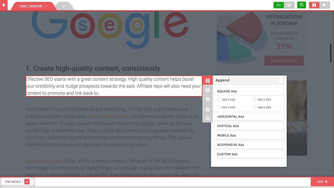 - You are able to change the arrangement of your advertisement with a few mouse clicks. Your new ad units can be placed wherever you like, and their AI technology uses automated A/B testing to boost revenue.
