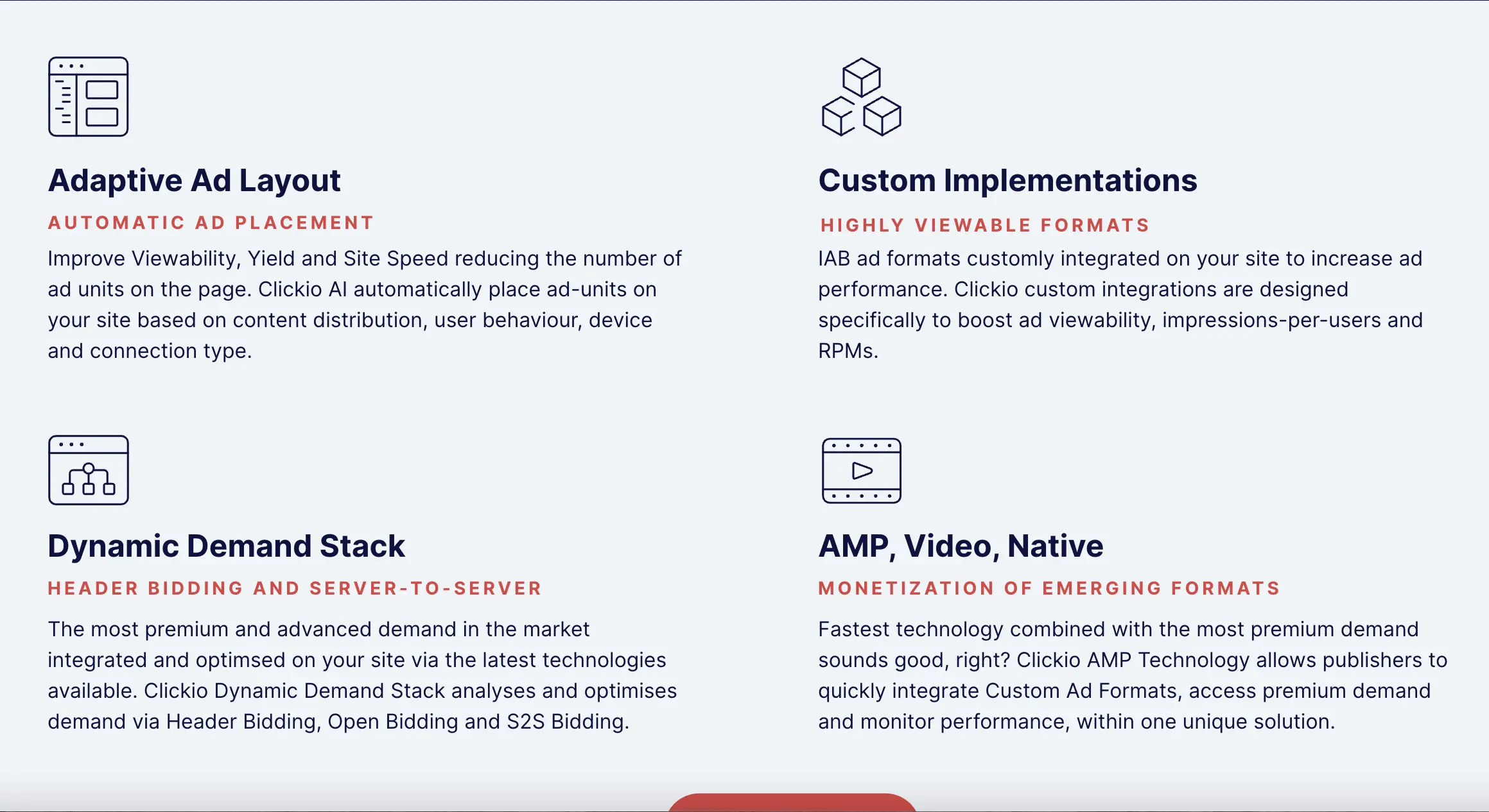 - Customizable Design: Clickio seamlessly integrates IAB ad formats onto your site, enhancing ad performance. Their custom integrations prioritize ad viewability, impressions-per-user, and RPMs, tailored to optimize revenue without compromising user experience.