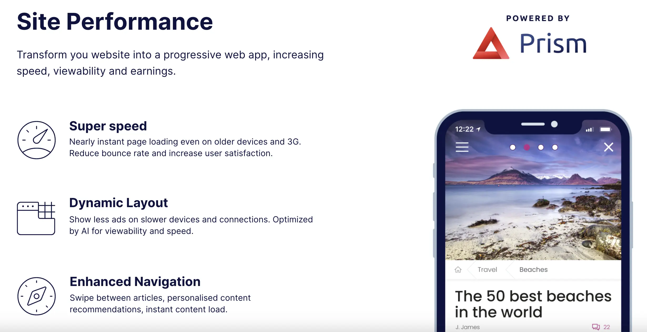 - Mobile Optimization: Their easy-to-install, cloud-based mobile template, Prism, increases user engagement and advertising revenue.