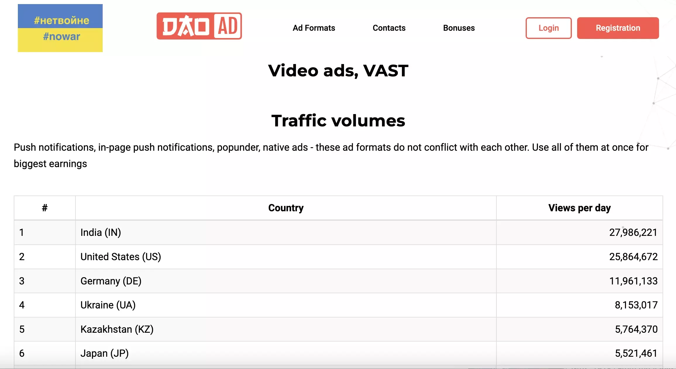 - Diverse Ad Formats: Dao.ad offers a variety of flexible ad formats including push, native, video, and popunder, for seamless monetization.