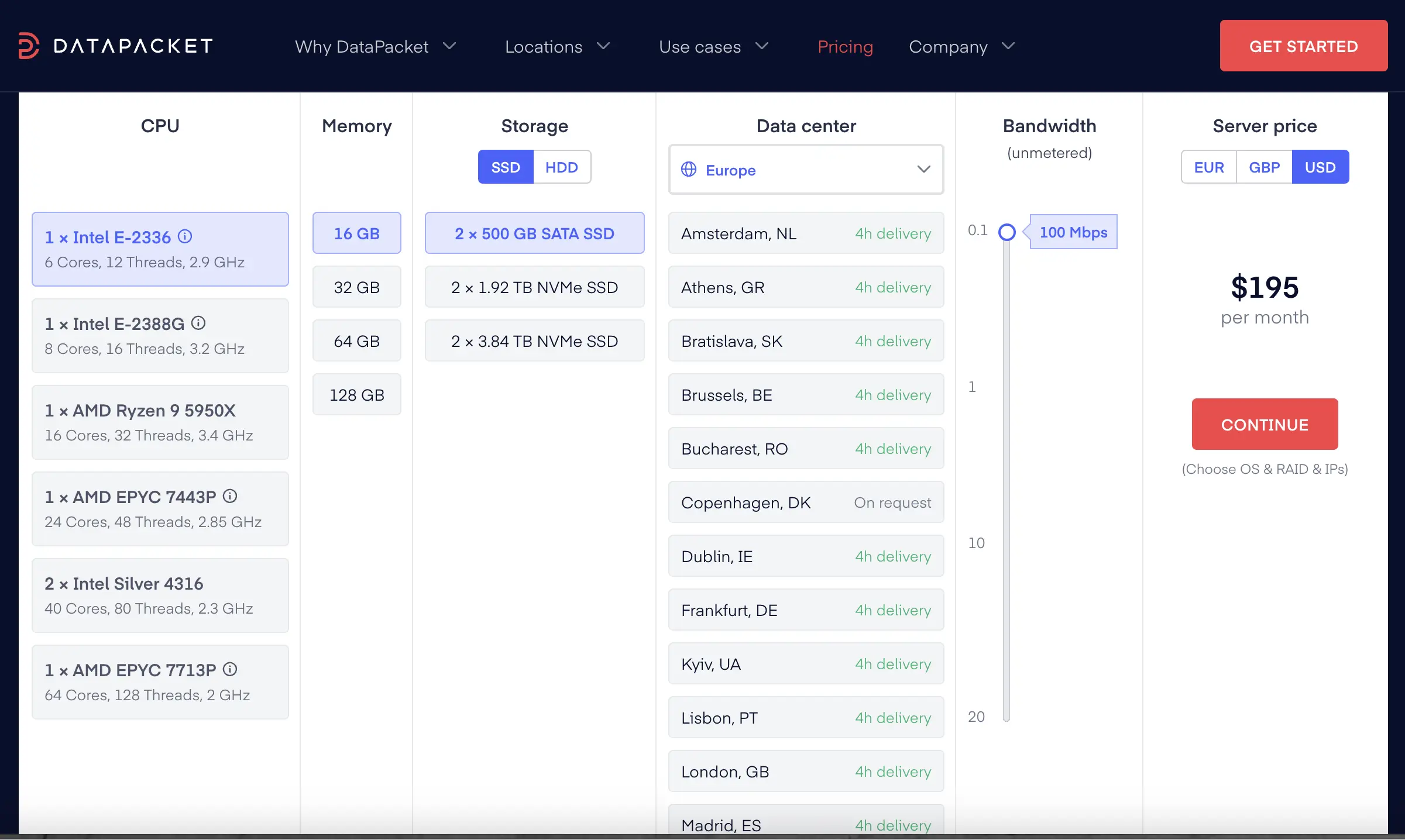 Single Server Plan: Offers unlimited data transfer, unshared 10-80GE ports, unmetered DDoS protection and no commitment at USD 195 per month.