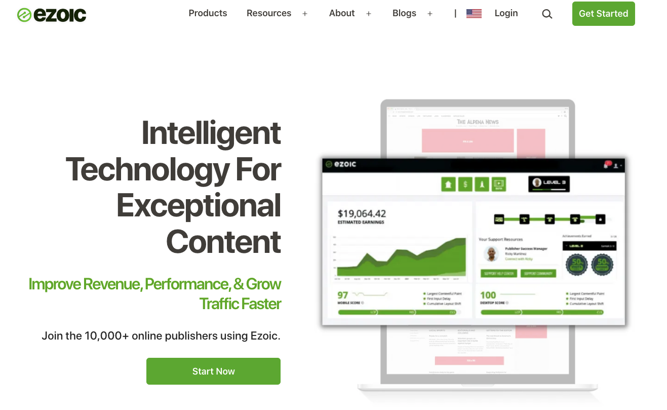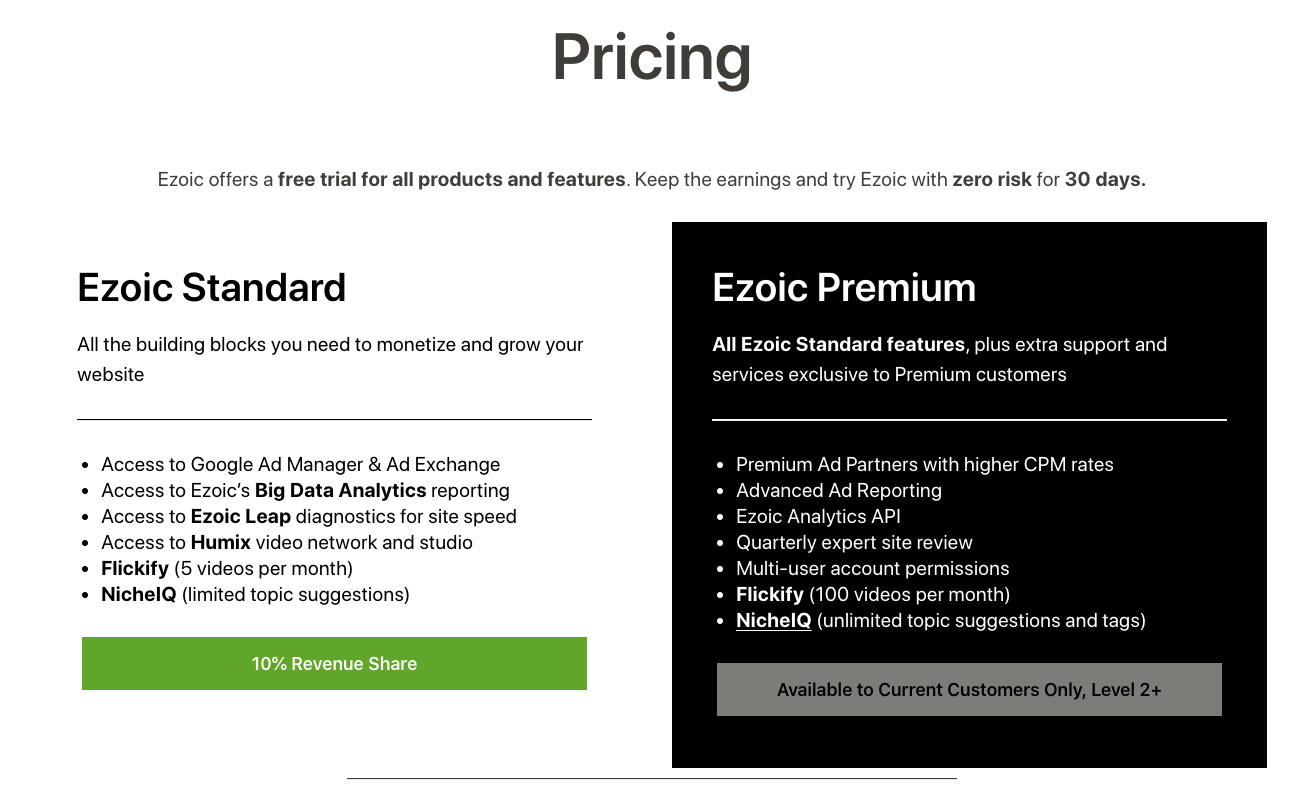 The Ezoic Standard plan includes all the building blocks you need to monetize and grow your website, like access to GAM and Ad Exchange, advanced reporting, diagnostics for site speed etc, for 10% revenue share.