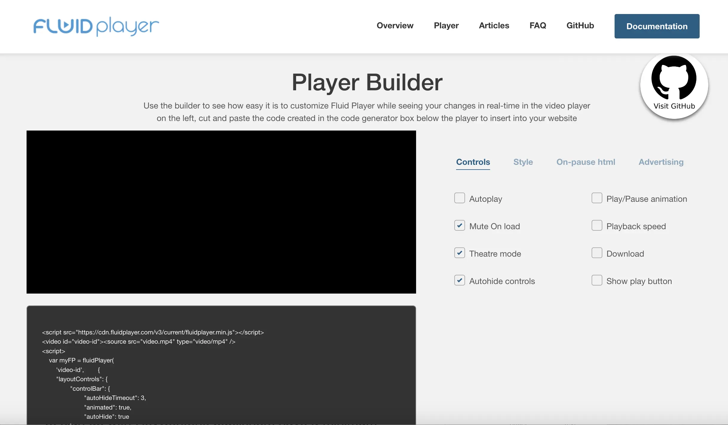 - Player Buider: It helps you easily customize Fluid Player while tracking your changes in real-time. You can cut and paste the code created in the code generator box to insert it into your website.