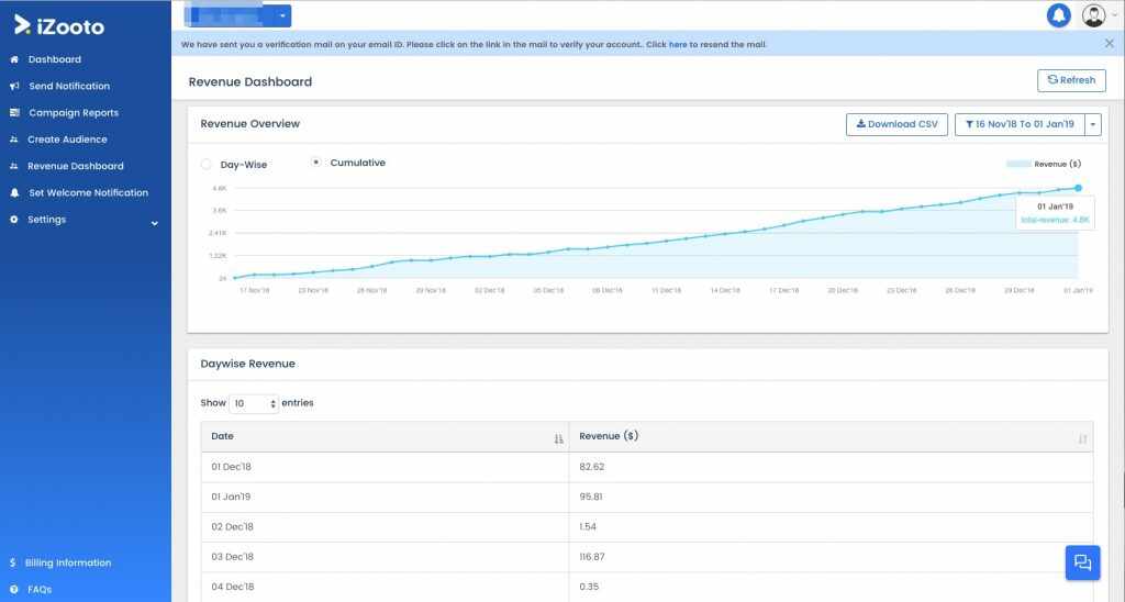 - News Hub: iZooto shows a log of all the notifications you have sent to your customers in one week. It is also personalized.