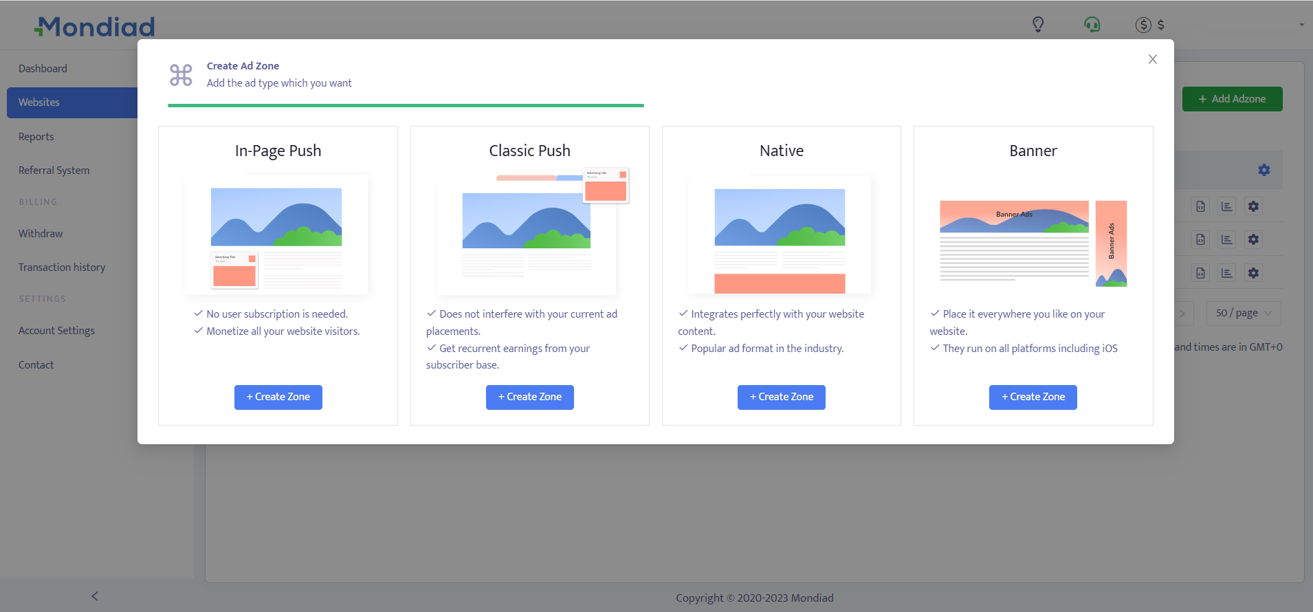 - Mondiad is a self-serve platform that helps publishers maximize their ad revenue through high quality traffic and fair prices.