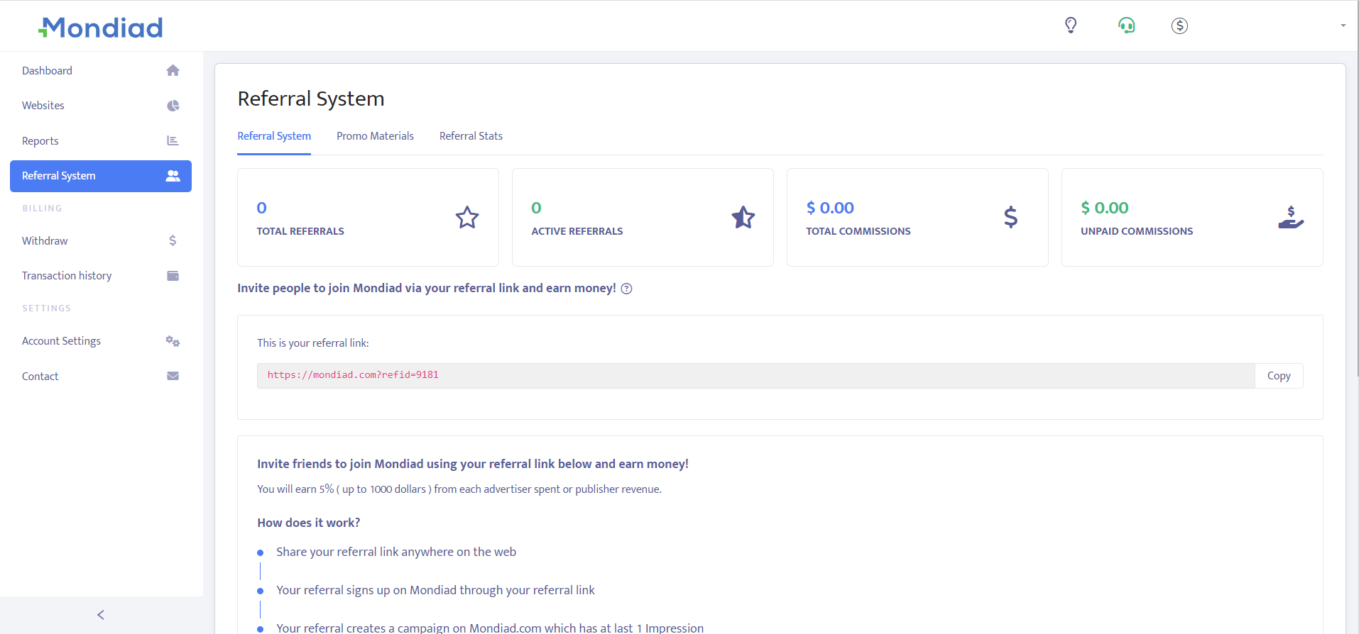 - Referral System: Mondiad gives you a 5% (up to 1000 USD) revshare through your referred members.