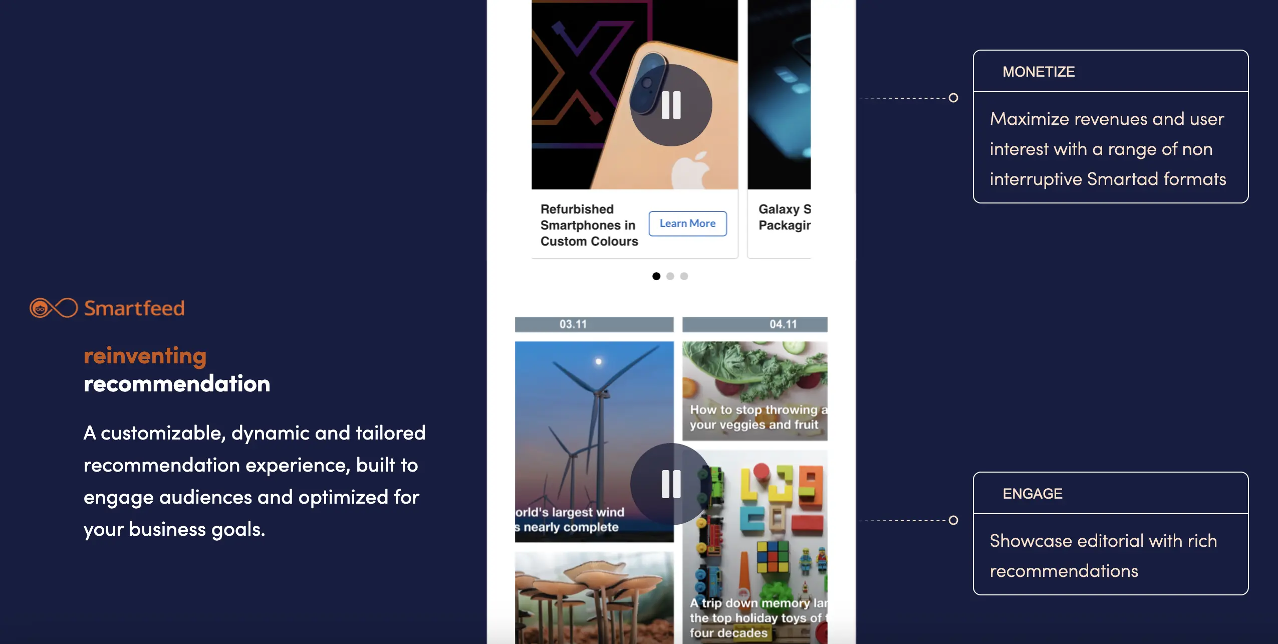 - Native Ad Server: Connect to the broadest range of native ad budgets, with Smartads that maximize engagement and RPM at every stage of the consumer journey.