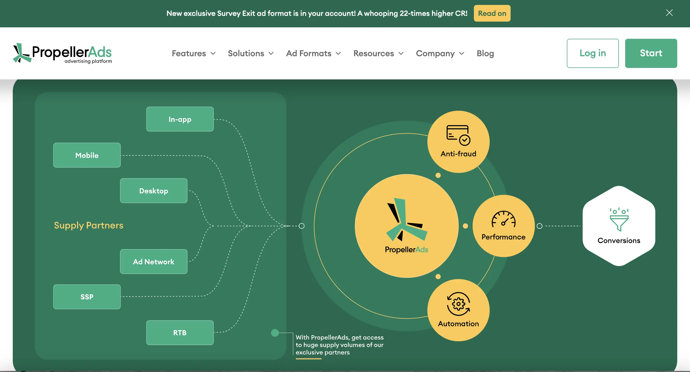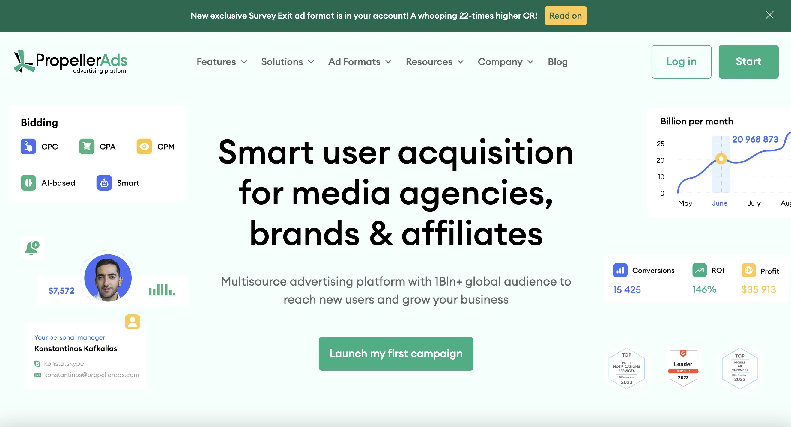 PropellerAds' proprietary algorithms enhance user and advertiser matching, optimizing the overall experience, serving as both a publisher ad network and a self-serve portal for advertisers to build and design their advertising campaigns.