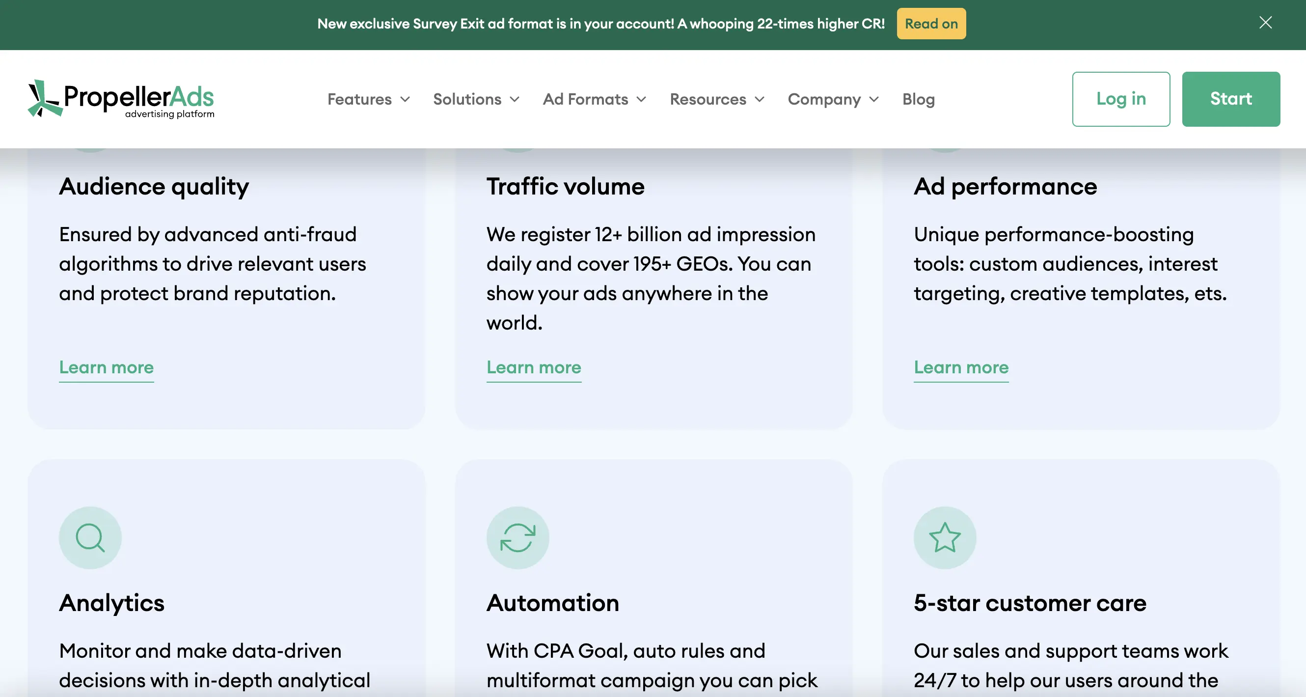 Propellerads offers display, native, video, and smartphone ads alongside affiliate services. The platform claims to offer the highest CPM rates in the industry, with eight years of experience and having worked with over 150K publishers.