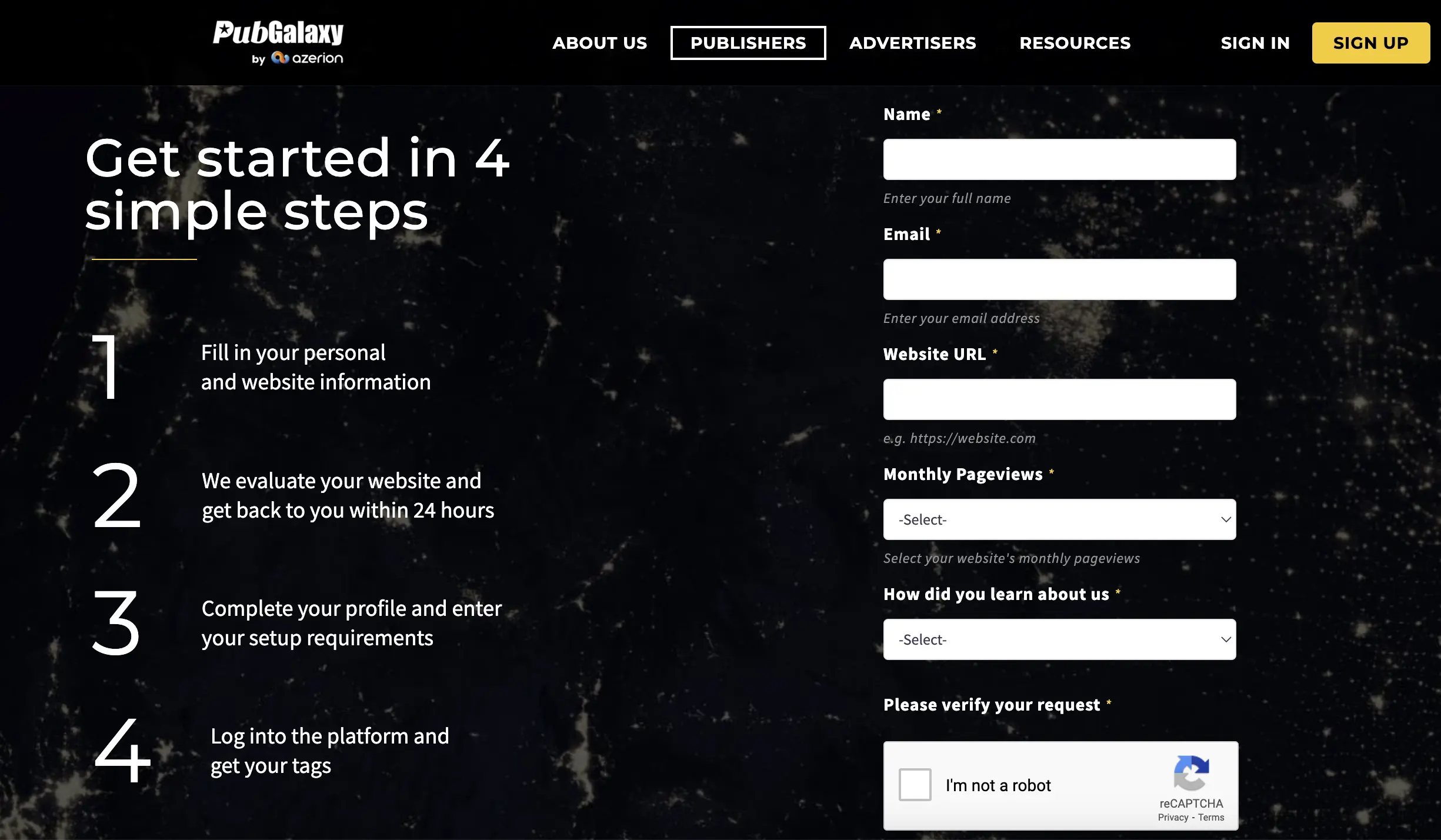 PubGalaxy does not have a hard requirement, but each inquiry undergoes an evaluation process where they review a wide range of criteria to find out if they can add value to your business. So, they advise you to have a minimum traffic of 7 million page views per month and for you to have an identifiable traffic acquisition track record. You must also clear Google's Transparency Report.