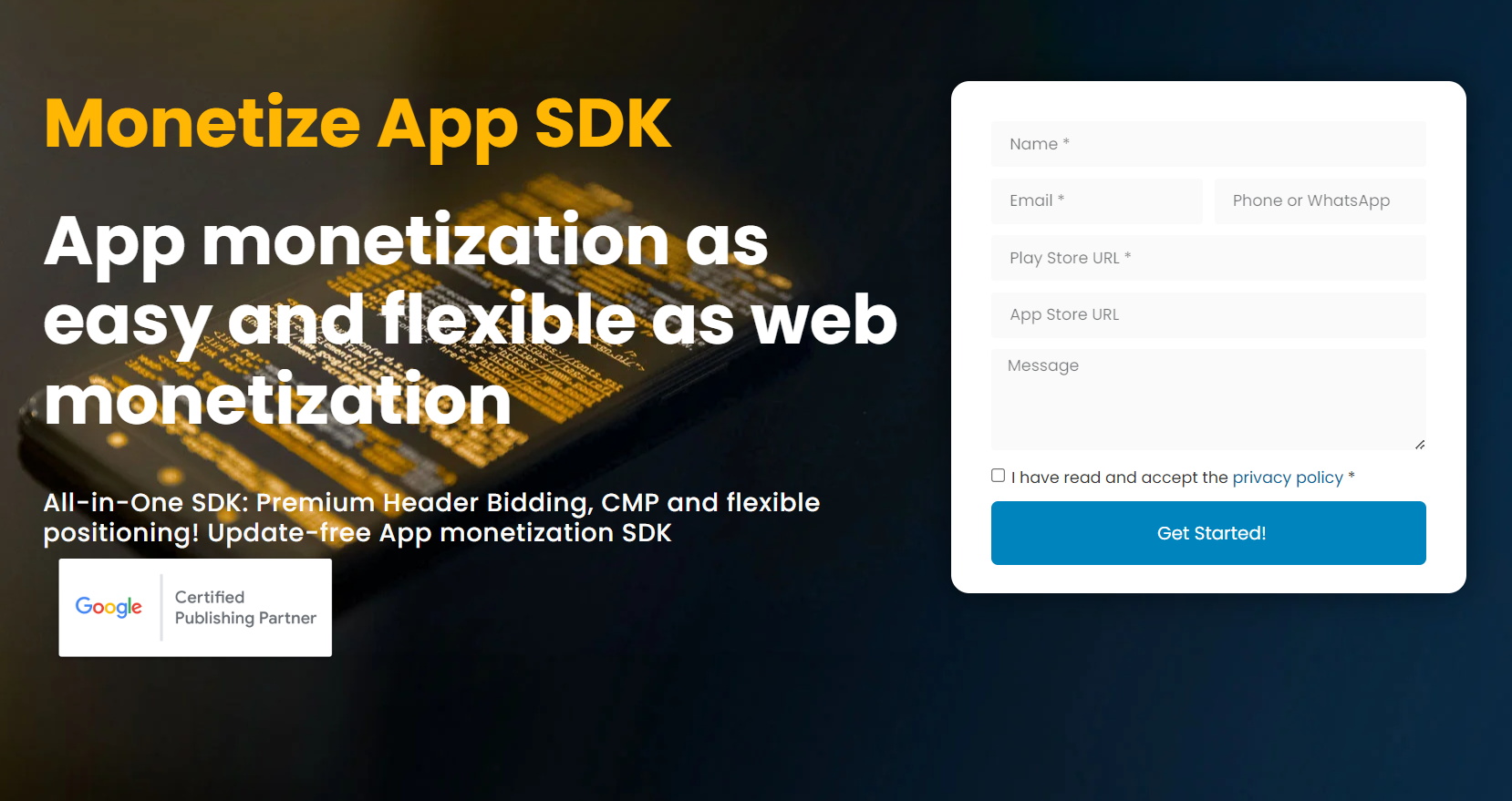 - Fully GDPR Compliant CMP: Publishers can leverage Refinery89’s premium CMP Consentmanager.net with no initial cost. The Monetize App SDK aims to simplify app monetization, addressing common challenges faced by app developers and publishers effectively.