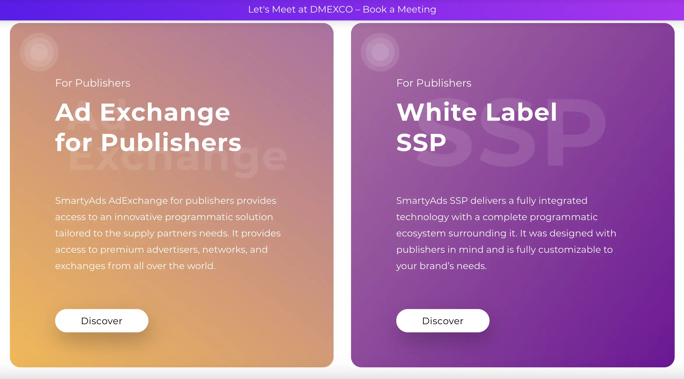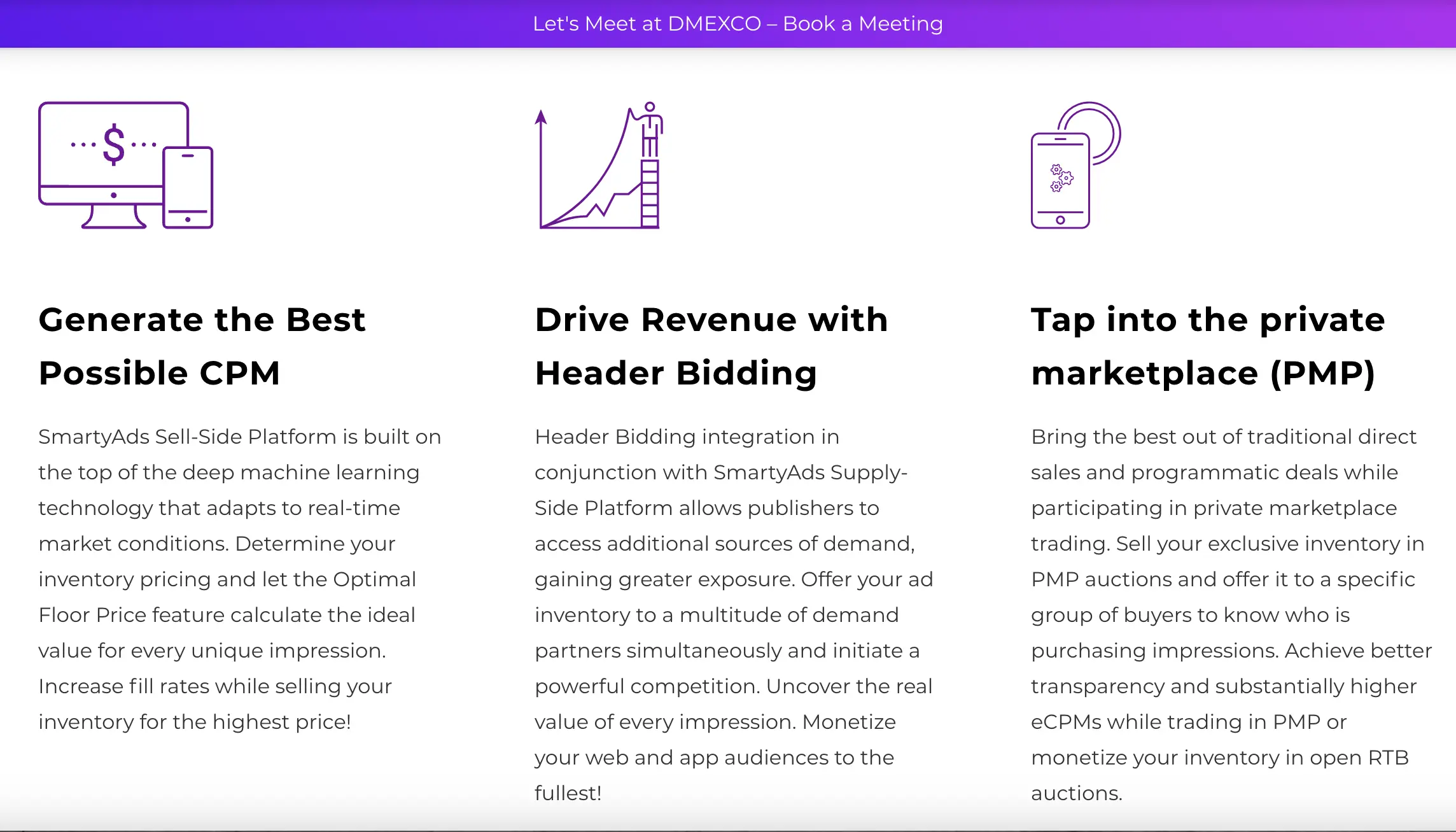 - PMP: Through SmartyAds SSP, you can sell your exclusive inventory in private marketplace auctions and offer it to a specific group of buyers to know who is purchasing impressions.