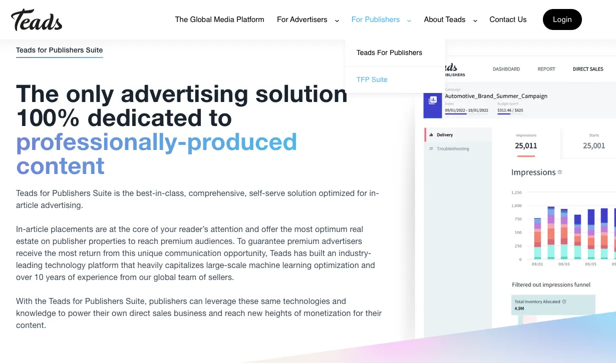 - Teads Suite: Offers self-serve solutions for publishers to make make the most of in-article advertising.
