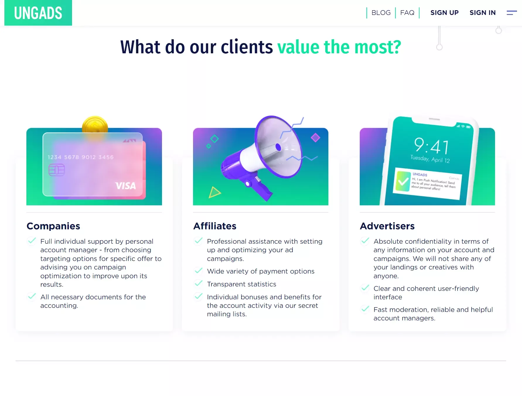 UngAds is a prominent advertising network offering multi-channel advertising solutions through CPM and CPA pricing models, ensuring profitable and efficient ad campaigns. The platform delivers detailed targeting options and supports publishers, advertisers, and affiliate marketers with powerful advertising tools.UngAds connects advertisers with over 2000 publishers across 190 countries, delivering expansive reach and high-quality traffic.